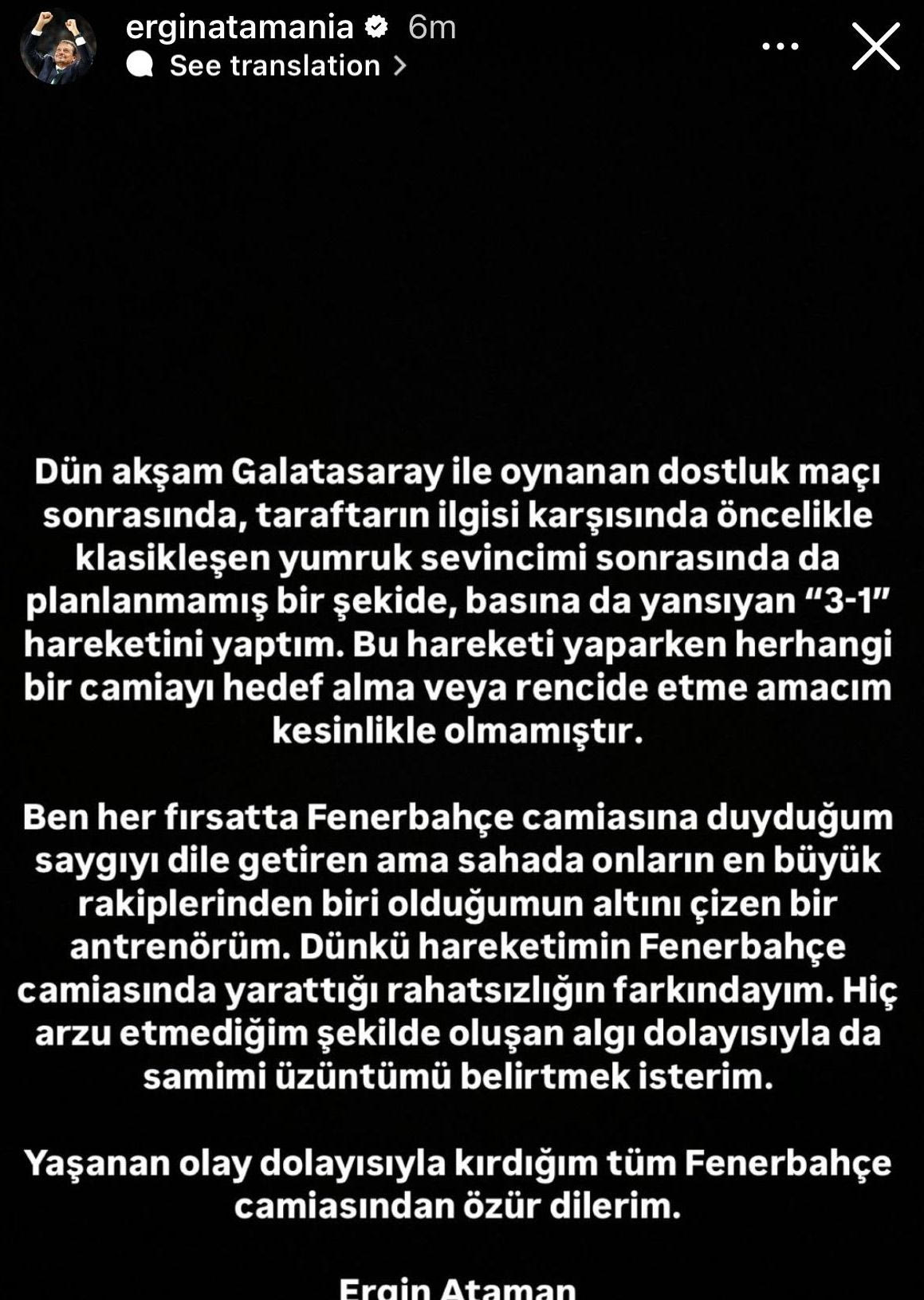 Ο Τούρκος τεχνικός απολογήθηκε μέσω του λογαριασμού του στο Instagram για την ένταση που προκλήθηκε, ζητώντας συγγνώμη από την κοινότητα της Φενέρ.