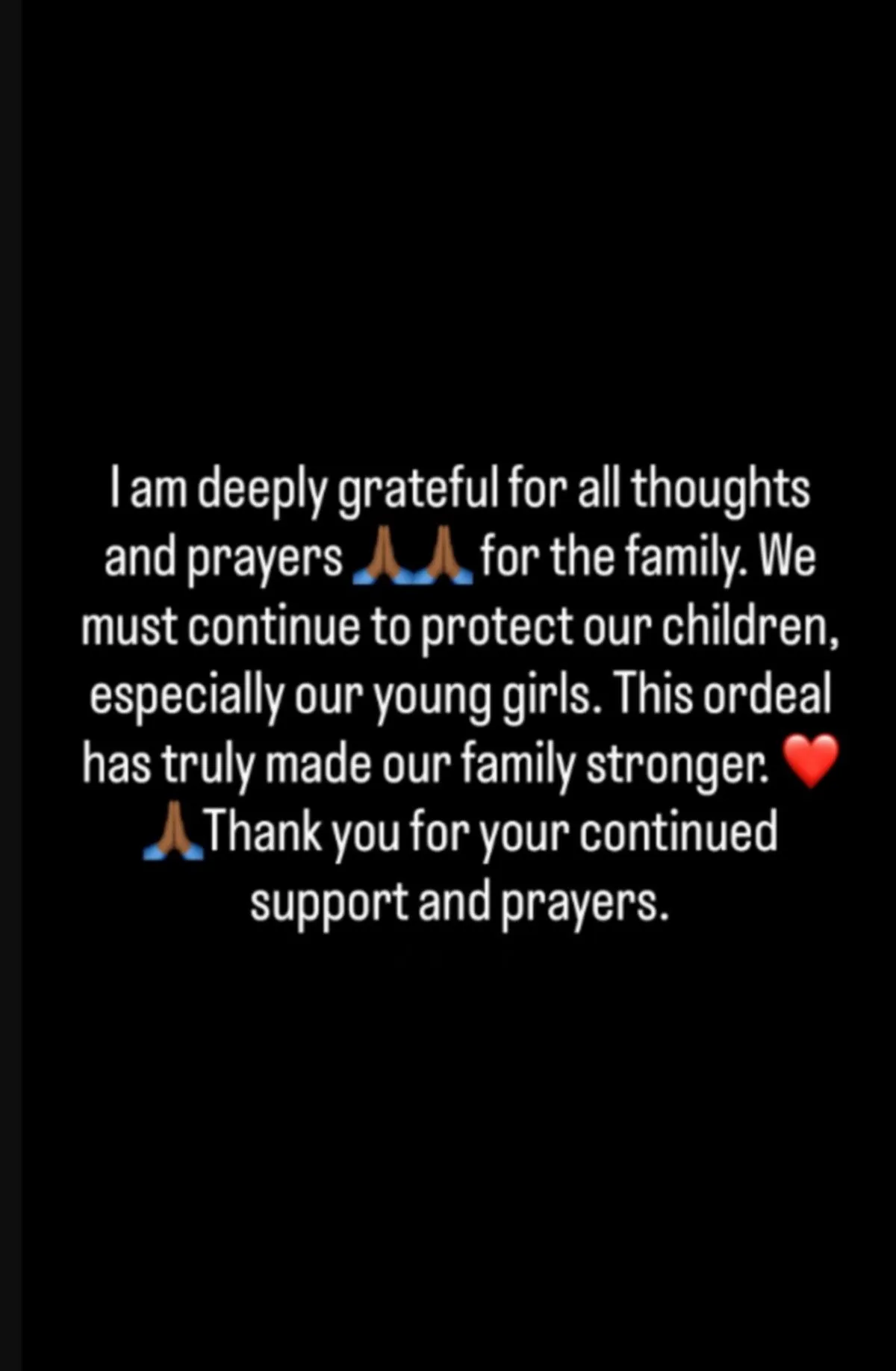 Ο Μπέβερλι έκανε ανάρτηση στα social media, γράφοντας: “Είμαι ευγνώμων για όλες τις σκέψεις και τις προσευχές για την οικογένεια. Πρέπει να συνεχίσουμε να προστατεύουμε τα παιδιά μας, ειδικότερα τα νεαρά κορίτσια. Αυτή η δοκιμασία έχει κάνει την οικογένειά μας πιο δυνατή. Ευχαριστώ για τη συνεχή υποστήριξη και τις προσευχές”.