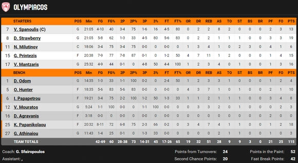 Το γεγονός πως ο Ολυμπιακός ολοκλήρωσε την αναμέτρηση έχοντας 6 παίκτες με διψήφιο αριθμό πόντων. Πρώτος ο Στρόμπερι (19π), δεύτερος ο Παπανικολάου (18π), τρίτος ο Μάντζαρης (16π), τέταρτος ο Πρίντεζης (15π), πέμπτος ο Σπανούλης (13π) και έκτος ο Χάντερ (10π). Οι “ερυθρόλευκοι” είχαν εξαιρετικό ποσοστό στα τρίποντα (14/31-45%), με τον Στρόμπερι να μετρά 4/5 από τα 6.75 μέτρα, με τους γηπεδούχους να κυριαρχούν στα ριμπάουντ (51-20).
