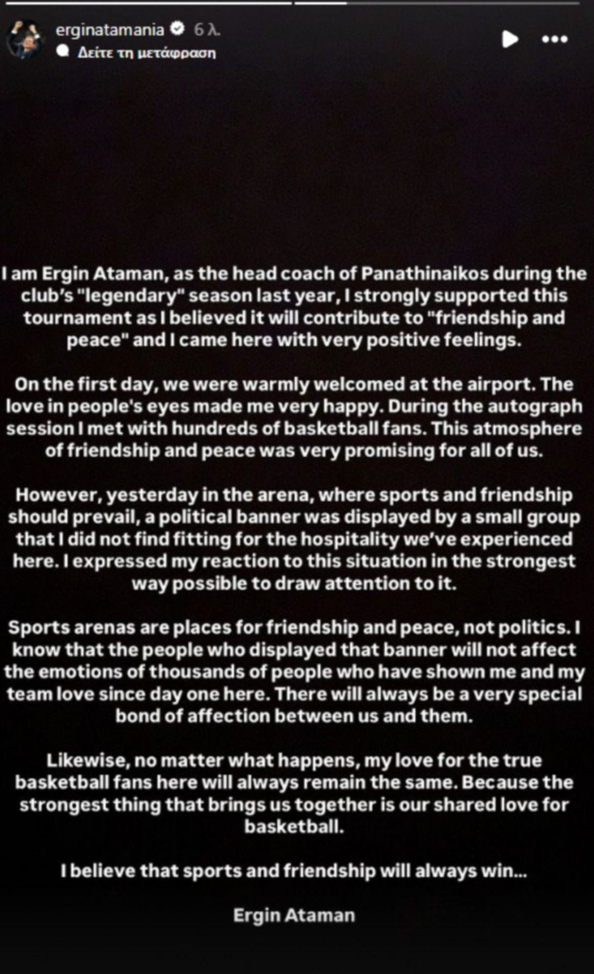 “Είμαι ο Εργκίν Αταμάν, ο προπονητής του Παναθηναϊκού στην περσινή “θρυλική” σεζόν την περσινή χρονιά. Υποστήριξα δυνατά το τουρνουά, επειδή πίστεψα ότι θα βοηθήσει στην ‘φιλία και την ειρήνη’ και ήρθα εδώ με πολύ θετικά συναισθήματα.