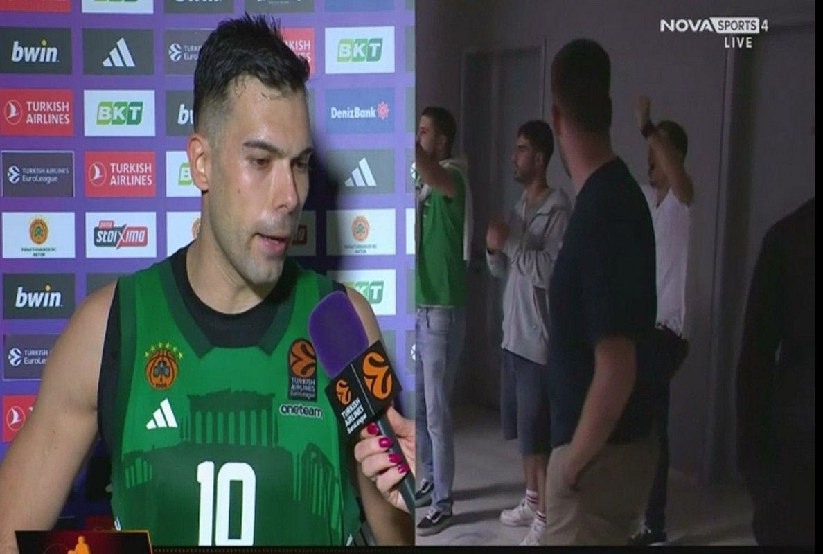 Ο αρχηγός του τριφυλλιού έκανε δηλώσεις στην κάμερα της “NOVA” και την ίδια ώρα ο Δημήτρης Γιαννακόπουλος μαζί με κάποιους φίλους των πράσινων τον αποθέωναν φωνάζοντας ρυθμικά το όνομα του.