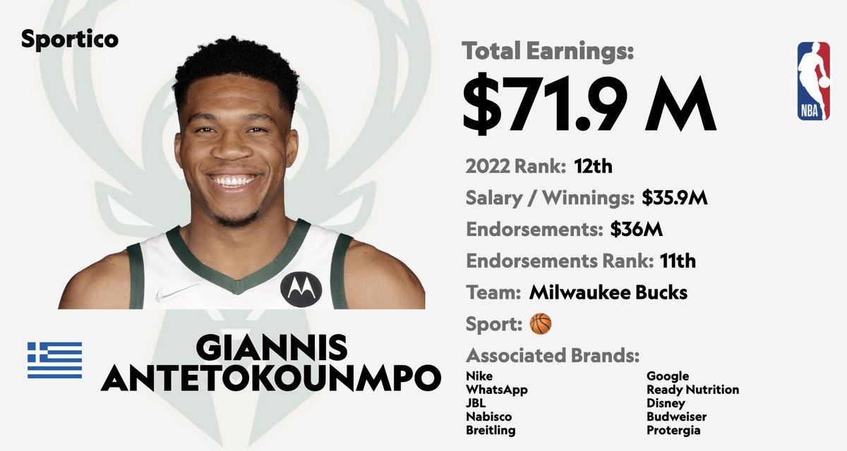 Πάνω από τεράστιους αθλητές όπως ο Τομ Μπρέιντι, ο Λούις Χάμιλτον, ο Άαρον Ρότζερς, ο Κιλιάν Εμπαπέ, ο Γκάρεθ Μπέιλ, ο Μαξ Φερστάπεν βρίσκεται ο Γιάννης Αντετοκούνμπο. Ο Greek Freak είναι στην 12η θέση της λίστας των πιο καλοπληρωμένων αθλητών του τελευταίου έτους, με το Sportico να εξηγεί πως κέρδισε 35.9 εκατομμύρια από το συμβόλαιό του με τους Μιλγουόκι Μπακς και 36 εκατομμύρια από εμπορικές συμφωνίες με εταιρείες όπως η Nike, η Whatsapp, η JBL, η Breitling, η Google, η Ready, η Disney, η Budweiser, η Nabisco και η Protergia.