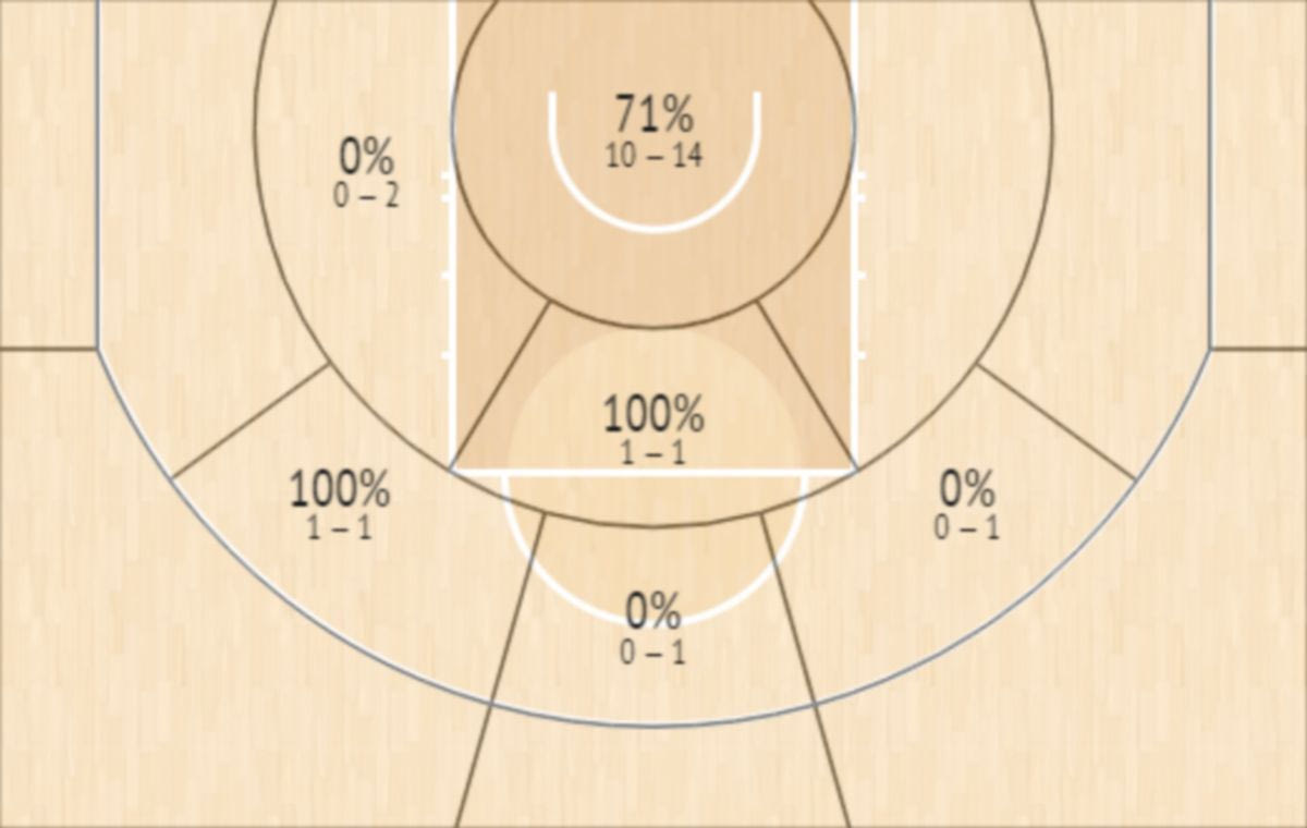 Στους πρώτους πέντε αγώνες της σειράς ο Γιάννης είχε 6/25 τρίποντα, κάτι που μεταφράζεται σε 1.2/5 τρίποντα ανά αγώνα, δηλαδή ποσοστό 24%. Στο Game 6 ο Γιάννης όμως δεν επιχείρησε κανένα τρίποντο, κάτι που είχε να συμβεί από έναν αγώνα με τους Πέισερς στις 3 Φλεβάρη (δεν είχε επιχειρήσει τρίποντο ούτε με τους Ρόκετς στις 29 Απριλίου, αλλά είχε παίξει μόλις 46 δευτερόλεπτα λόγω τραυματισμού). Για την ακρίβεια πήρε συνολικά τρία σουτ πίσω από τα 5 μέτρα, ευστοχώντας μόνο στο ένα από αυτά. Το δε Shot Chart του το δείχνει αυτό ξεκάθαρα: