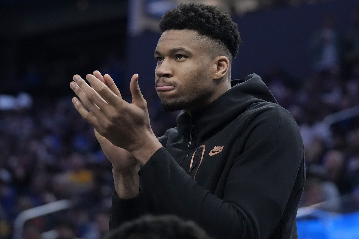 Milwaukee Bucks forward Giannis Antetokounmpo reacts from the bench during the second half of an NBA basketball game against the Golden State Warriors in San Francisco, Saturday, March 11, 2023. (AP Photo/Jeff Chiu)