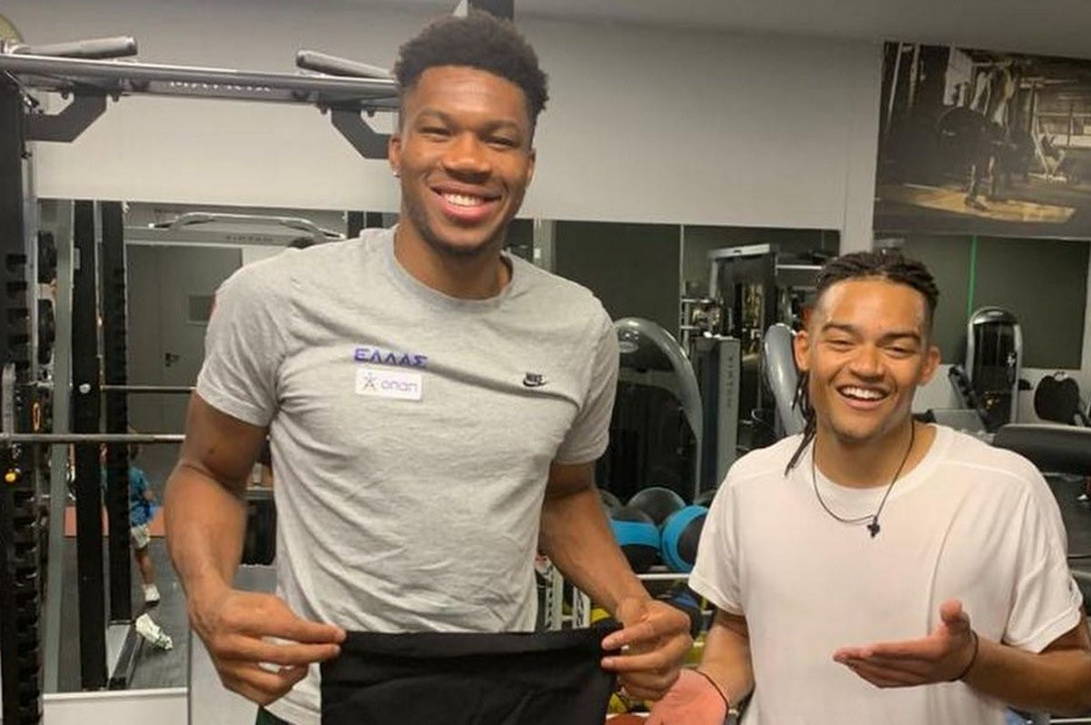 Με μπλουζάκι της Εθνικής Ελλάδας και με τον καλό του φίλο, Εμμανουήλ Καραλή προπονήθηκε ο Γιάννης Αντετοκούνμπο.