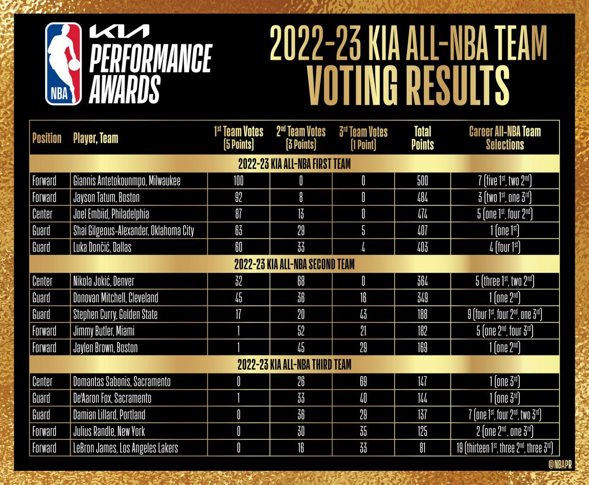 Δίπλα στον Greek Freak που έχει πλέον πέντε συμμετοχές σε κορυφαίες πεντάδες (2019, 2020, 2021, 2022, 2023) με 100/100 ψήφους και στις πέντε, μπήκαν οι Σάι Γκίλτζιους-Αλεξάντερ (Θάντερ), Λούκα Ντόντσιτς (Μάβερικς), Τζέιτον Τέιτουμ (Σέλτικς), Τζοέλ Εμπίντ (Σίξερς).