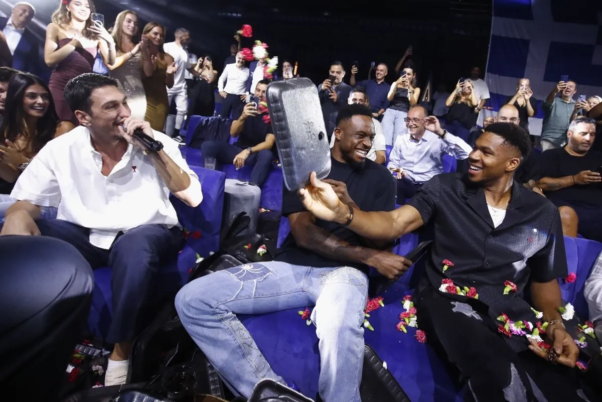 Στις φωτογραφίες που έχουν κυκλοφορήσει, ο Λαρεντζάκης κάθεται πρώτο τραπέζι πίστα και ερμηνεύει, ενώ γύρω του τον απολαμβάνουν η σύντροφός του, ο Θανάσης Αντετοκούνμπο, αλλά και ο Πρόεδρος της ΕΟΚ, Βαγγέλης Λιόλιος που επίσης έδωσε το δικό του ρεσιτάλ.