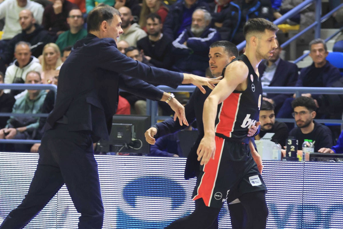Ο Γιώργος Μπαρτζώκας μπήκε στο παρκέ για να βάλει τέλος στις διαμαρτυρίες του Μιχάλη Λούντζη προς τους διαιτητές