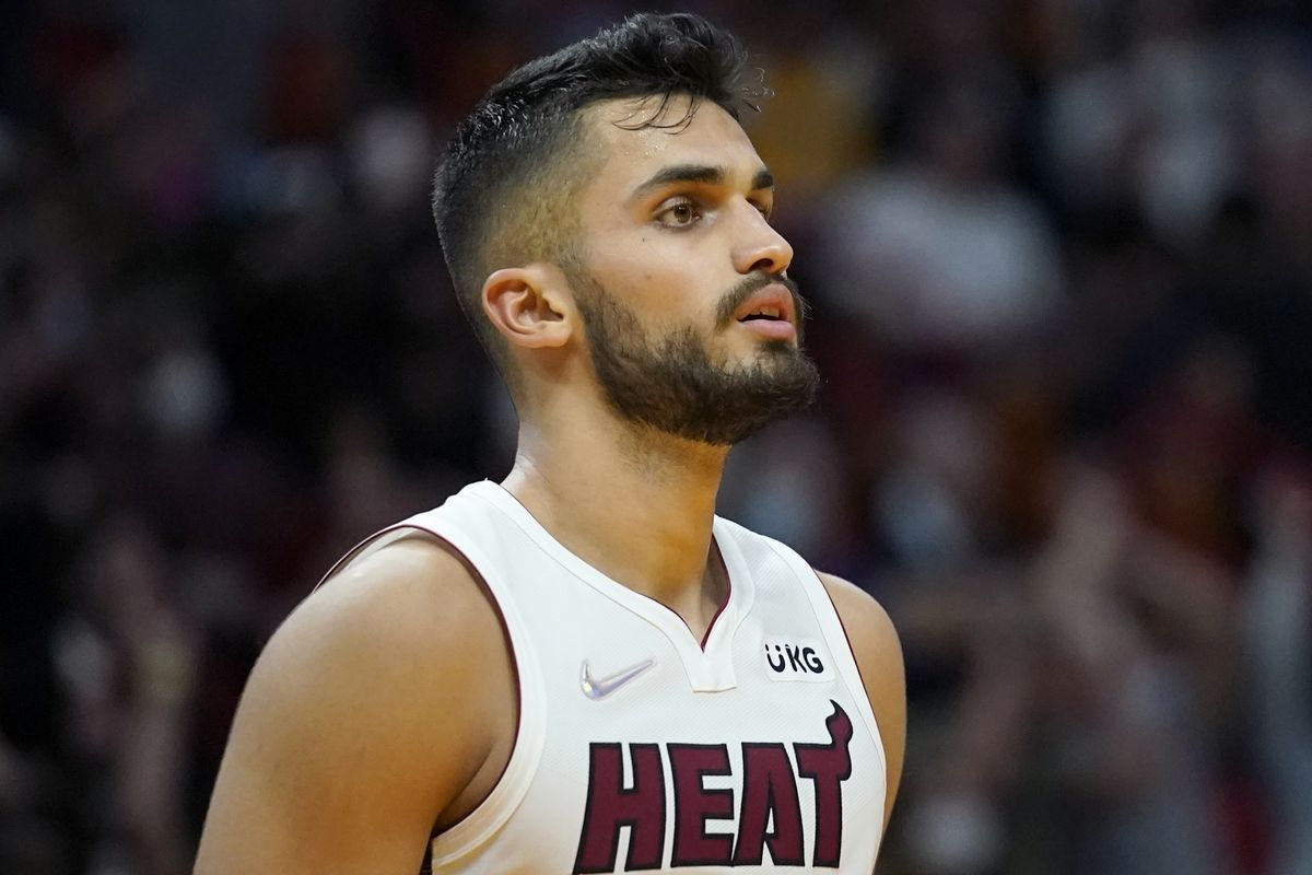 Miami Heat center Omer Yurtseven (77) stands on the court during the second half of an NBA basketball game against the Washington Wizards, Tuesday, Dec. 28, 2021, in Miami. The Heat won 119-112. (AP Photo/Lynne Sladky)