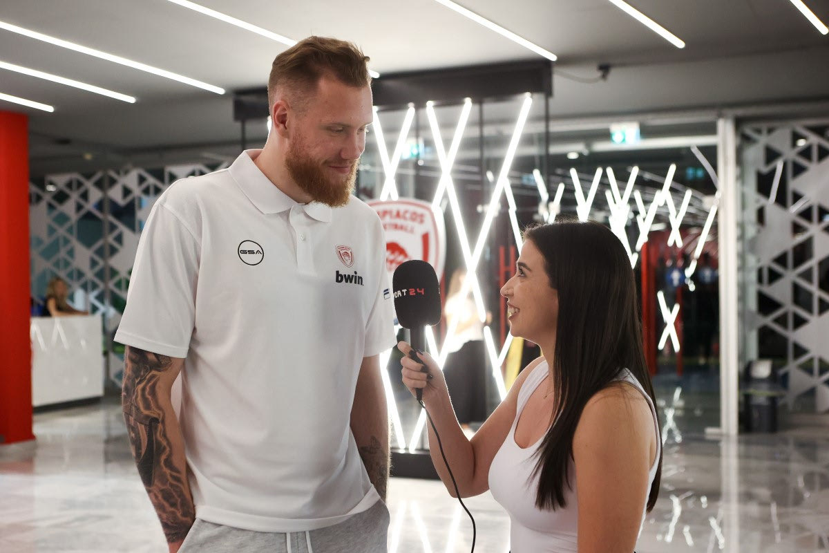 Τις εμφανίσεις του για τη σεζόν 2023/24 παρουσίασε ο Ολυμπιακός, στο πλαίσιο εκδήλωσης που έλαβε χώρα στο ανανεωμένο VIP Lounge του ΣΕΦ. Αμέσως μετά την τελετή στο SPORT24 και τη Βασιλική Καραμούζα μίλησε το νέο μεταγραφικό απόκτημα των ερυθρόλευκων, ο Ίγκνας Μπραζντέικις.