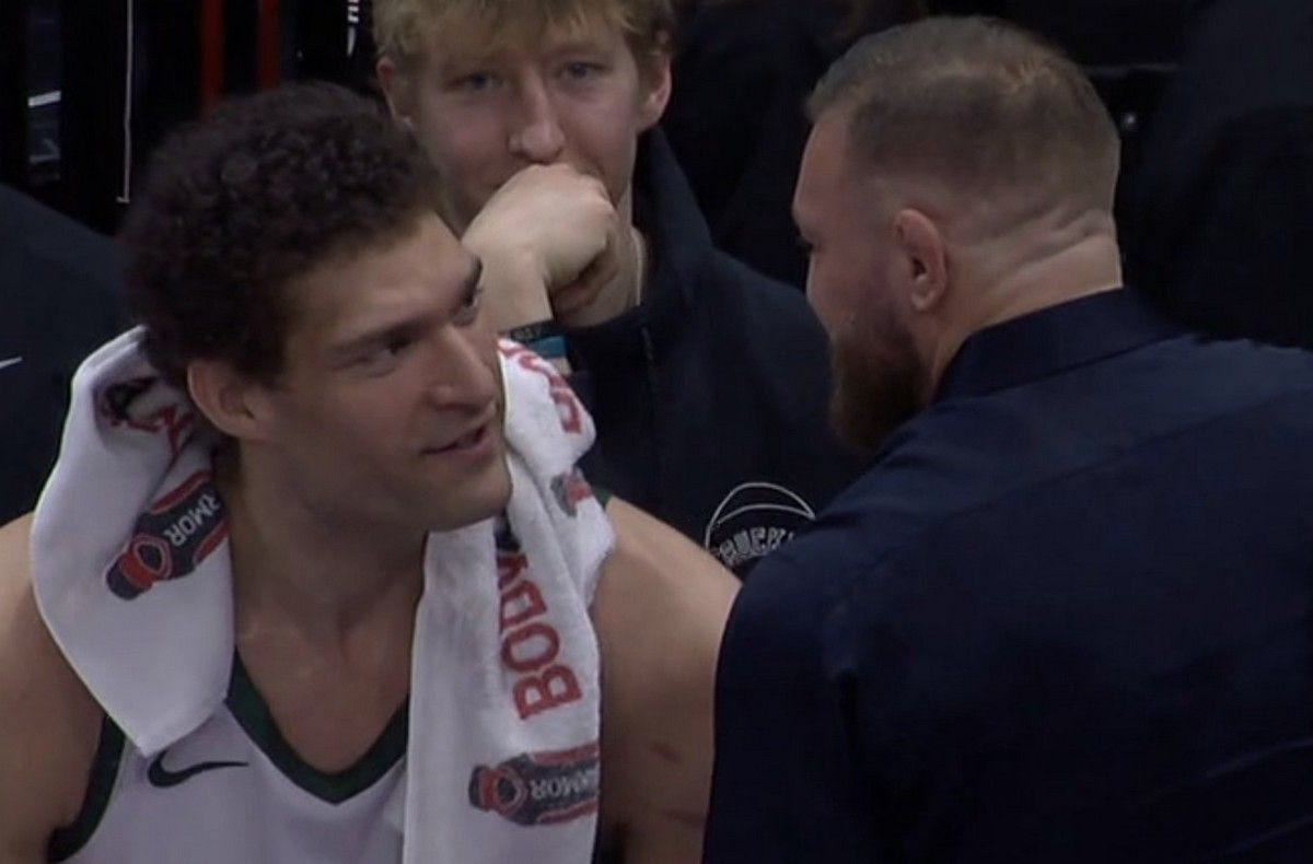 Ο Ιρλανδός θρύλος του MMA βρέθηκε στο Τζαζ – Μπακς, έδωσε συνέντευξη στο κανάλι της ομάδας του Μιλγουόκι για να προμοτάρει τα προϊόντα του, έβγαλε φωτογραφίες και αμέσως μετά περπάτησε περιμετρικά του αγωνιστικού χώρου, πέρασε μπροστά από τον πάγκο των Ελαφιών και σταμάτησε για να μιλήσει με τον Μπρουκ Λόπεζ. Σαν να μην υπήρχε αγώνας σε εξέλιξη…