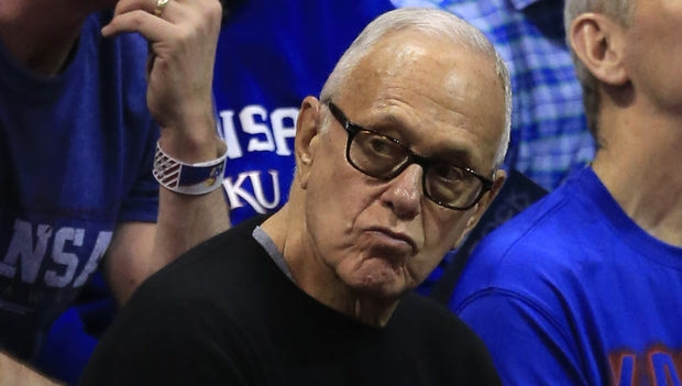 Former Kansas coach Larry Brown frowns during the first half of an NCAA college basketball game against Iowa State in Lawrence, Kan., Saturday, Feb. 4, 2017. (AP Photo/Orlin Wagner)