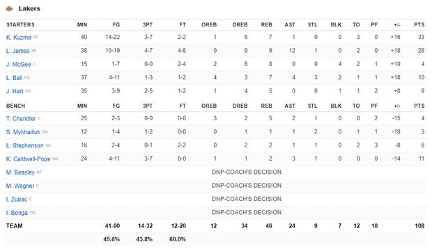 Ο Κάιλ Κούζμα με 33 πόντους ήταν ο κορυφαίος των νικητών, με τον ΛεΜπρόν να προσθέτει 28 πόντους, 9 ριμπάουντ και 12 ασίστ.