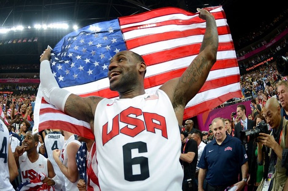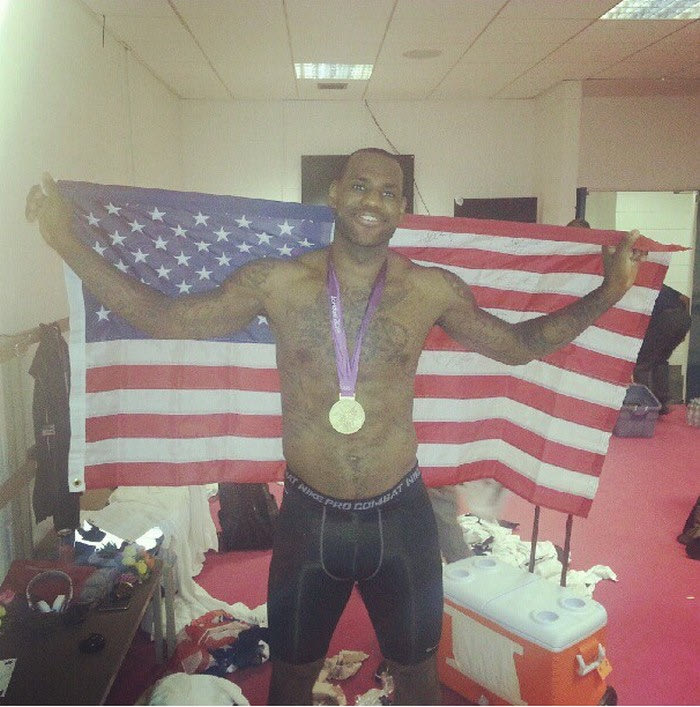 Ο ΛεΜπρόν Τζέιμς φωτογραφήθηκε με την σημαία της Αμερικής μέσα στα αποδυτήρια, όντας γυμνός από τη μέση και πάνω, φορώντας όμως το ακριβοθώρητο μετάλλιό του.