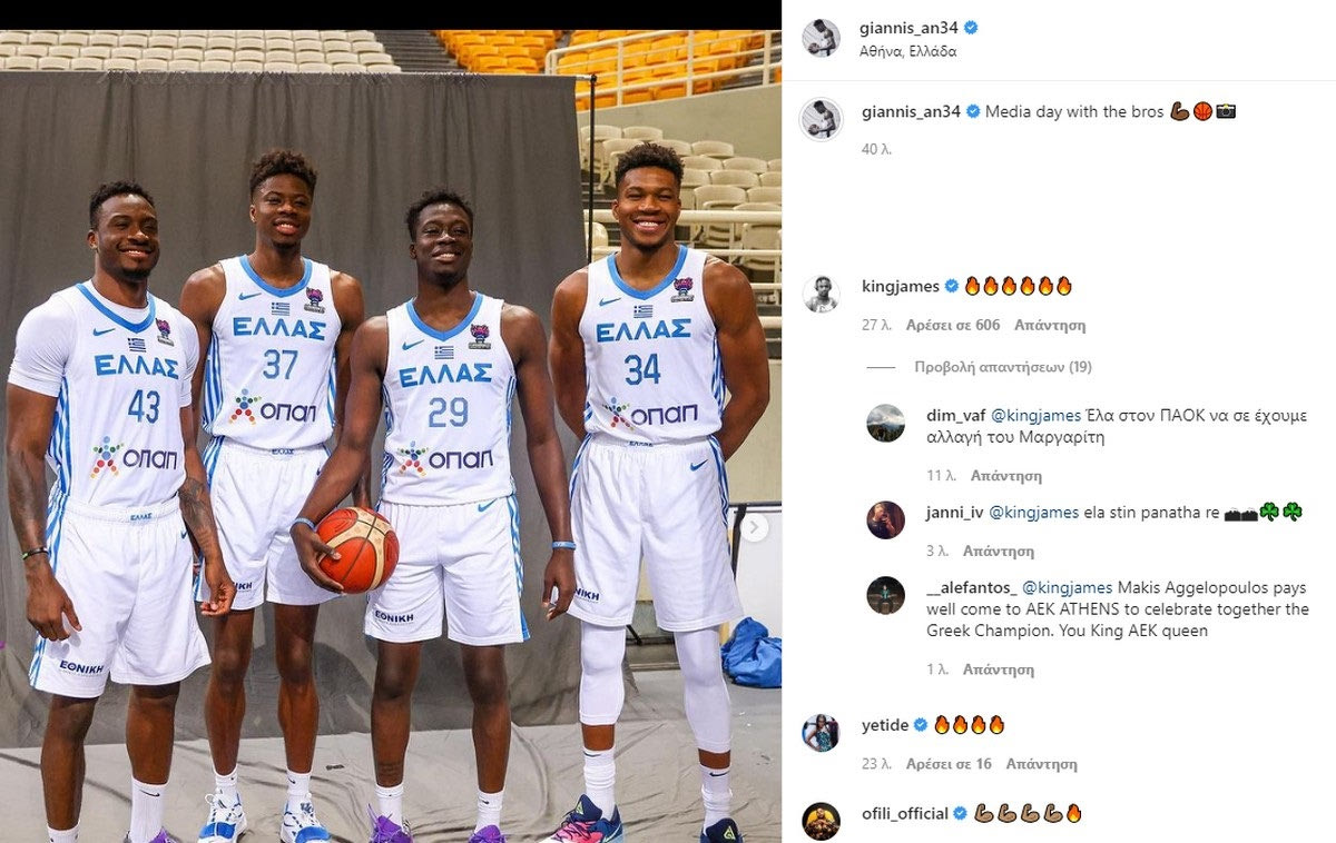 Ο Βασιλιάς των Λος Άντζελες Λέικερς βάζει σχεδόν σε κάθε δημοσίευση του Greek Freak emojis με φωτιές και αυτό έκανε και το βράδυ του Σαββάτου (6/8) στην εικόνα που έβαλε ο ηγέτης των Μιλγουόκι Μπακς με τα αδέλφια του από τη media day της Εθνικής.
