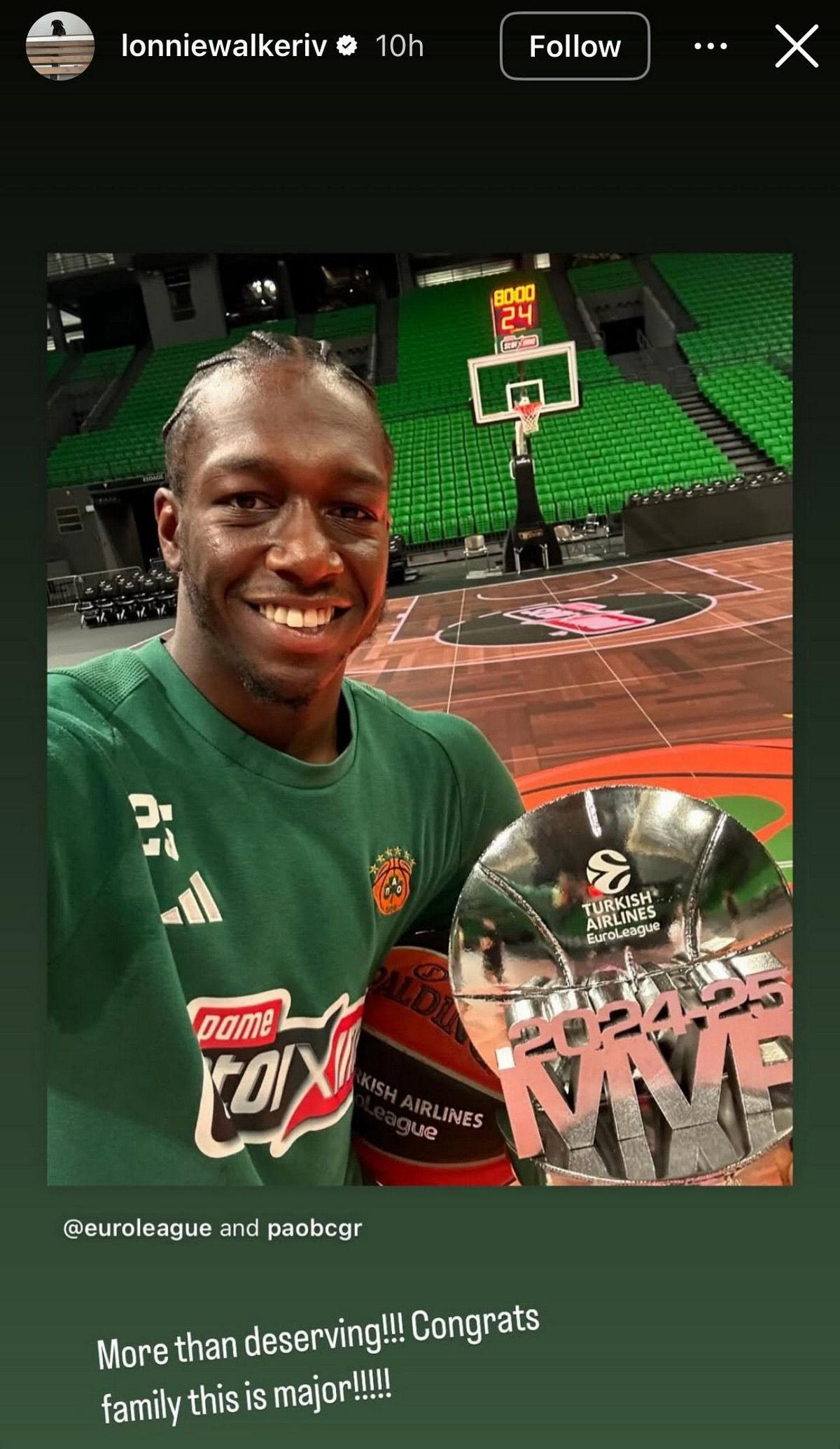 Ο Γουόκερ, που πλέον αγωνίζεται στο NBA με τους Φιλαντέλφια Σίξερς, συνεχάρη τον σούπερ σταρ του Παναθηναϊκού AKTOR για την ανάδειξή του σε MVP της EuroLeague, γράφοντας σε story στο Instagram: “Κάτι περισσότερο από άξιος. Συγχαρητήρια οικογένεια, αυτό είναι τεράστιο”.