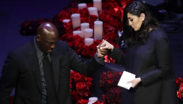 Συγκίνηση στο Staples Center, με τον Μάικλ Τζόρνταν να κρατά τη Βανέσα Μπράιαντ από το χέρι, δευτερόλεπτα μετά από τον συγκλονιστικό λόγο της για τον Κόμπι και την Τζιάνα Μπράιαντ (PHOTO).