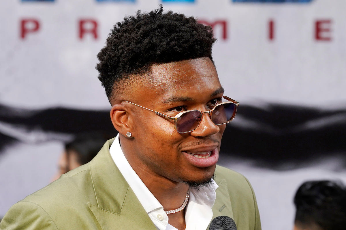 NBA basketball player Giannis Antetokounmpo is interviewed on the red carpet at the premiere of the Disney+ film "Rise," Wednesday, June 22, 2022, at Walt Disney Studios in Burbank, Calif. The film is based on the story of Antetokounmpo and his family, who emigrated from Nigeria to Greece before Giannis and two of his brothers found success in the National Basketball Association. (AP Photo/Chris Pizzello)