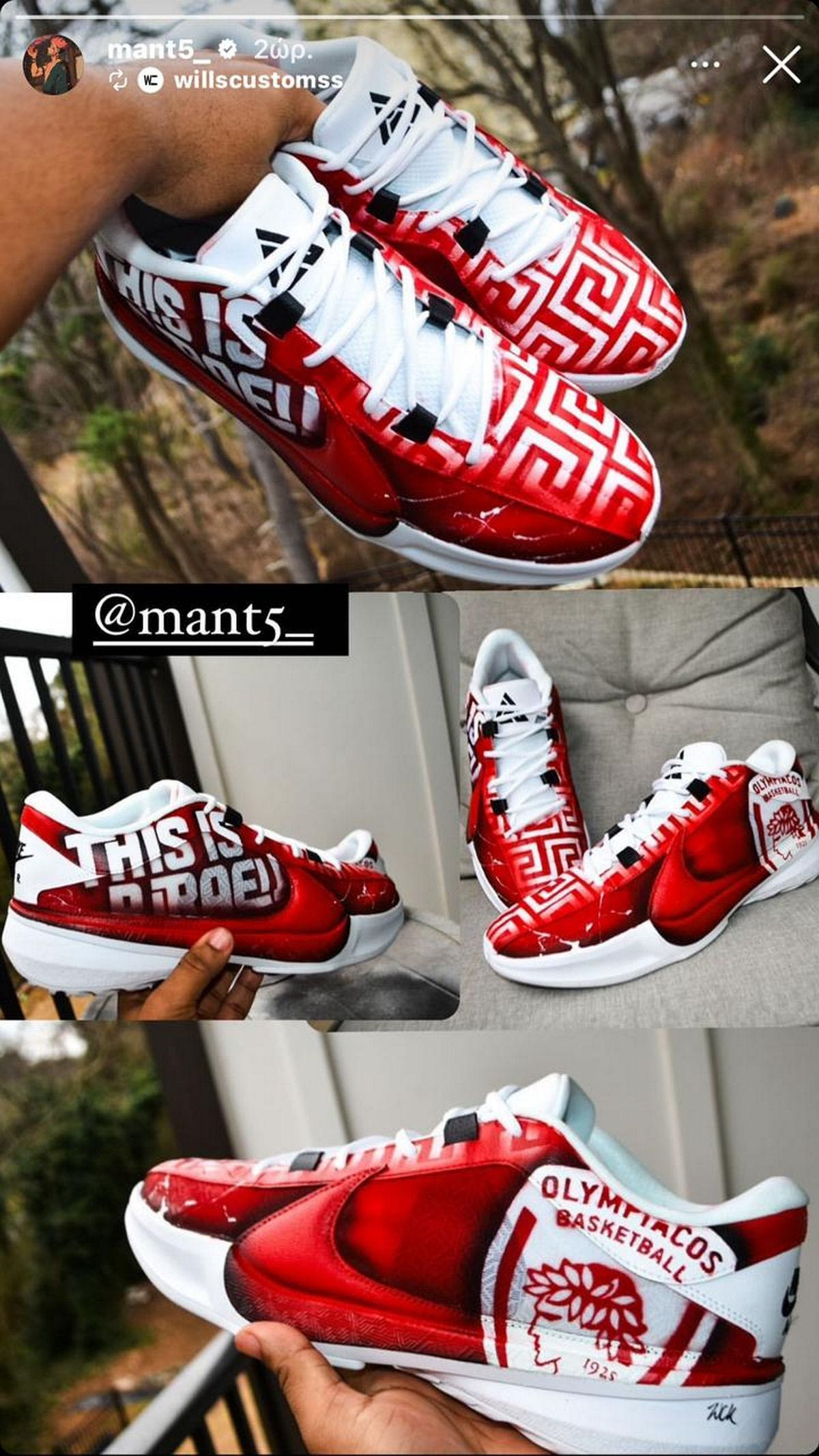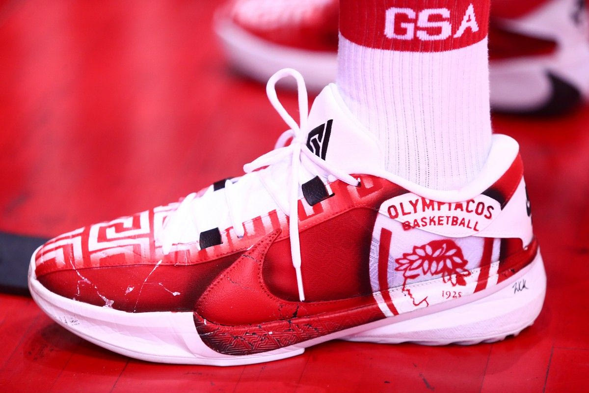 Τα παπούτσια “Giannis Antetokounmpo Freak 5”, από την μία πλευρά έχουν το σήμα του μπασκετικού Ολυμπιακού και από την άλλη γράφουν χαρακτηριστικά: “This is Piraeus”.