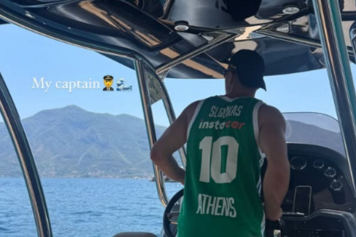 Ο Νεμάνια Νέντοβιτς σε ρόλο καπετάνιου σε σκάφος, φορώντας τη φανέλα του αρχηγού του Παναθηναϊκού, Κώστα Σλούκα.
