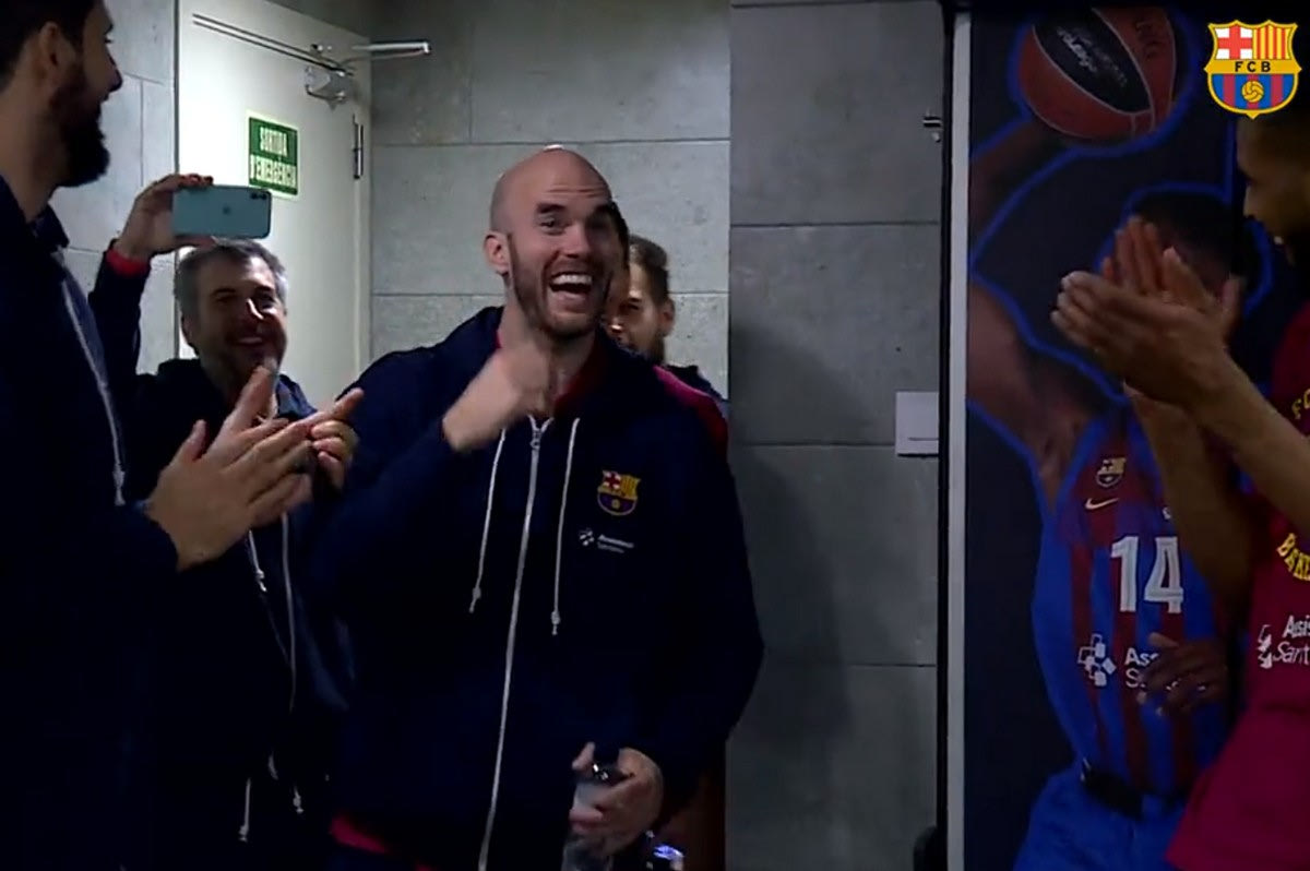 Οι Καταλανοί είχαν τοποθετήσει μπαλόνια στην θέση του στα αποδυτήρια του γηπέδου, με τον Καλάθη να χαμογελάει και να δέχεται ξανά τα συγχαρητήρια των συμπαικτών του πριν βγάλουν όλοι μαζί και μία αναμνηστική φωτογραφία για να θυμούνται τη στιγμή.