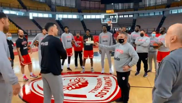 Συγκεκριμένα, μετά το τέλος της προπόνησης στο ΣΕΦ, όλοι οι παίκτες και προπονητικό σταφ, συγκεντρώθηκαν στο κέντρο του γηπέδου για να σβήσει την τούρτα του, με το γνωστό τραγούδι γενεθλίων.