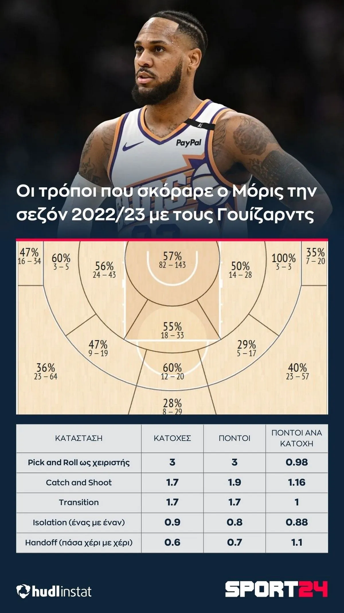 Ο Μόρις είναι ένας floor general, ένας παίκτης που οργανώνει δηλαδή μία ομάδα και δεν κά΄νει λάθη. Αυτά τα δύο ωστόσο δεν θα ήταν αρκετά για να διαγράψει μία πορεία 9 χρόνων στο NBA, αν δεν είχε ένα ακόμα σημαντικό στοιχείο στο παιχνίδι του: Το καλό σουτ από στάση (Catch and Shoot). Σύμφωνα με το Hudl Instat, από την σεζόν 2020/21 κι έπειτα – που υπάρχουν διαθέσιμα data – ο Μόρις σουτάρει με 39% στα τρίποντα σε κατάσταση Catch and Shoot, σε ένα ελίτ νούμερο.
