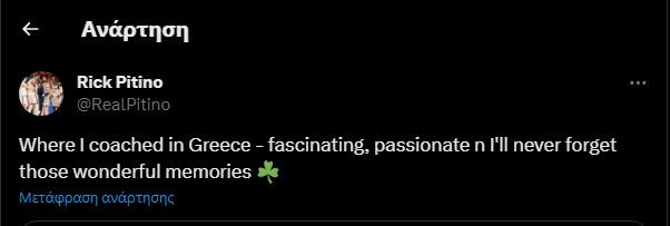 “Εκεί που προπόνησα στην Ελλάδα. Συναρπαστικό. Παθιασμένο. Δεν θα ξεχάσω ποτέ αυτές τις υπέροχες αναμνήσεις”, έγραψε ενδεικτικά στον λογαριασμό του στο Twitter ο Hall of Famer τεχνικός.