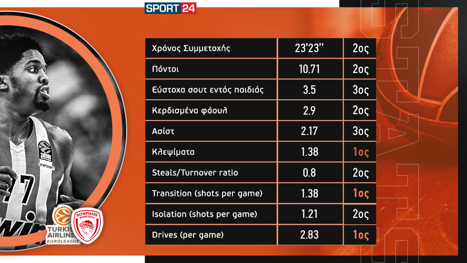 Κάπως έτσι, αυτή την στιγμή είναι το Νο2 των ερυθρολεύκων στην EuroLeague, σε χρόνο συμμετοχής (23’23”) και πόντους (10.71). Όχι όμως μόνο σε αυτές τις δύο στατιστικές κατηγορίες.