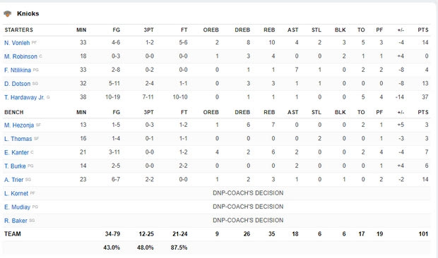 Για τους Νικς, ο Τιμ Χάρνταγουεϊ είχε 37 πόντους με 7/11 τρίποντα, με τους Νόα Βονλέ και Αλόνζο Τρίερ να προσθέτουν από 14 πόντους.