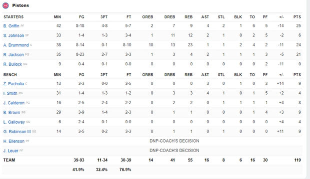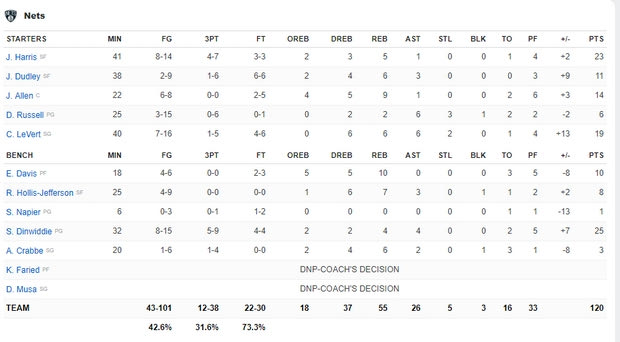 Οι Νετς φρόντισαν να δείξουν στους Πίστονς ότι ακόμα έχουν αρκετό δρόμο μπροστά τους μέχρι να θεωρήσουν ότι ανήκουν στην… ελίτ της Ανατολής. Παίζοντας όμορφο μπάσκετ, το Μπρούκλιν κατάφερε να πάρει μία σπουδαία νίκη με 120-119 στην παράταση. Ήρωας τον Νετς ήταν ο Σπένσερ Ντίνγουϊντι, αφού ήταν αυτός που έστειλε το παιχνίδι στην παράταση, ισοφαρίζοντας σε 110-110 με τρίποντο, ενώ στην συνέχεια ήταν πάλι αυτός που με τρίποντο με 7 δευτερόλεπτα να μένουν για το φινάλε του έξτρα πεντάλεπτου διαμόρφωσε το τελικό σκορ.