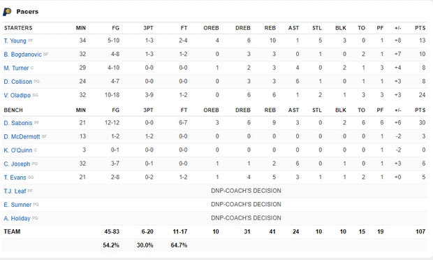 Ο Σαμπόνις ήρθε, όπως πάντα, από τον πάγκο, ολοκληρώνοντας τον αγώνα με 30 πόντους με 12/12 δίποντα (!), 6/7 βολές, 9 ριμπάουντ και 3 ασίστ σε 21 λεπτά συμμετοχής (!) σε μία εμφάνιση που σίγουρα δεν θα ξεχάσει εύκολα. Από κοντά τον ακολούθησε και ο Βίκτορ Ολαντίπο με 24 πόντους, με τον Θαντέους Γιανγκ να προσθέτει 13 πόντους, 10 ριμπάουντ και 5 κλεψίματα.