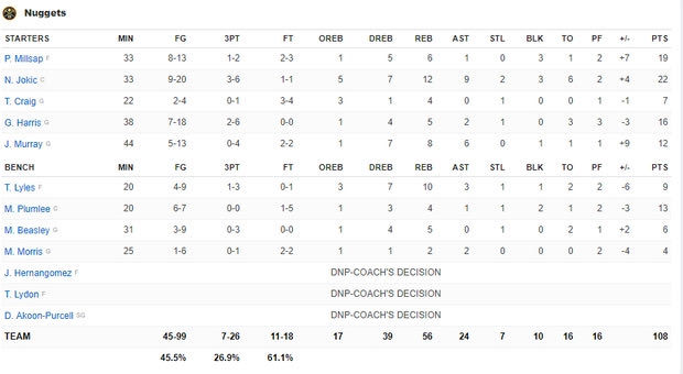 Ο Νίκολα Γιόκιτς με 22 πόντους, 12 ριμπάουντ και 9 ασίστ ήταν ο κορυφαίος των νικητών, με τον Πιλ Μίλσαπ να προσθέτει 18 πόντους και τον Γκάρι Χάρις 16 πόντους. Για τους Μπουλς, ο Ζακ ΛαΒίν είχε 28 πόντους και ο Ουέντελ Κάρτερ 25 πόντους και 8 ριμπάουντ.