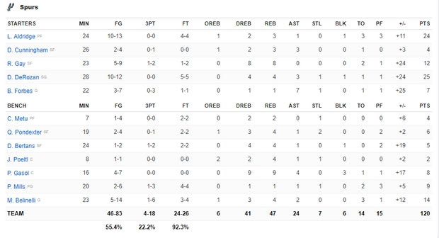 Ο ΝτεΜάρ ΝτεΡόζαν με 25 πόντους και ο ΛαΜάρκους Όλντριτζ με 24 πόντους ήταν οι κορυφαίοι των νικητών. Για τους Σανς, ο Τι Τζέι Ουόρεν είχε 21 πόντους και ο Μίκαλ Μπρίτζες 16 πόντους.