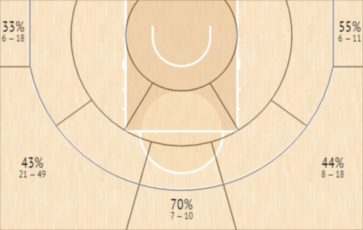 Όλα αυτά τα νούμερα/στατιστικά δεν θα είχαν βέβαια την ίδια αξία, αν δεν επιβεβαιώνονταν την στιγμή που πρέπει. Ήτοι στην τελευταία περίοδο των αγώνων. Το εντυπωσιακό με την περίπτωσή του 26χρονου φόργουορντ λοιπόν είναι πως στο “κλείσιμο” των αναμετρήσεων είναι ακόμη πιο αποδοτικός, αφού την περσινή σεζόν σούταρε με 45.65% από την περιφέρεια.