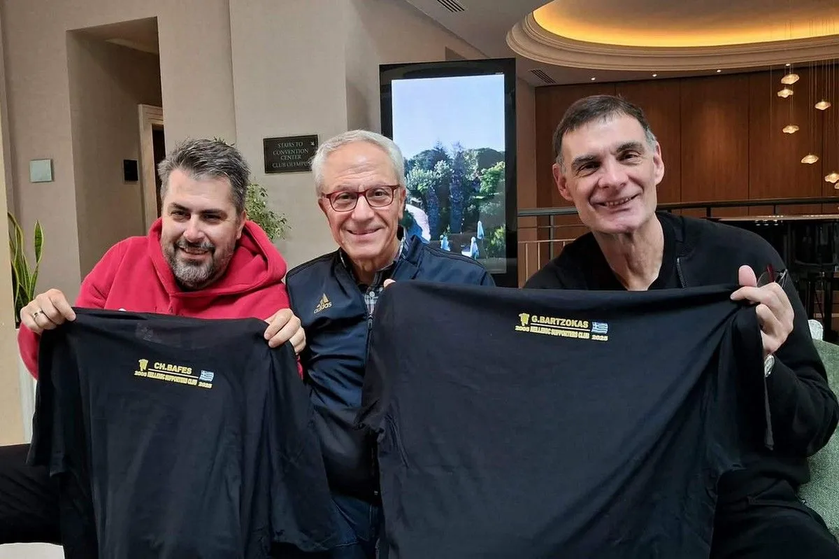 Συγκεκριμένα, αντιπροσωπεία του επισκέφτηκε τον Έλληνα προπονητή και έδωσαν σε εκείνον και τον Χρήστο Μπαφέ, μπλούζες με τα ονόματά τους, ποζάροντας χαμογελαστοί.