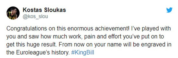 ” Συγχαρητήρια για ένα τεράστιο επίτευγμα! Έχω παίξει μαζί σου και έχω δει πόση δουλειά, πόνο και προσπάθεια έχεις ρίξει για να πετύχεις αυτό το σπουδαίο επίτευγμα. Από εδώ και πέρα, το όνομά σου θα βρίσκεται πάντα στην ιστορία της EuroLeague. #KingBill”.