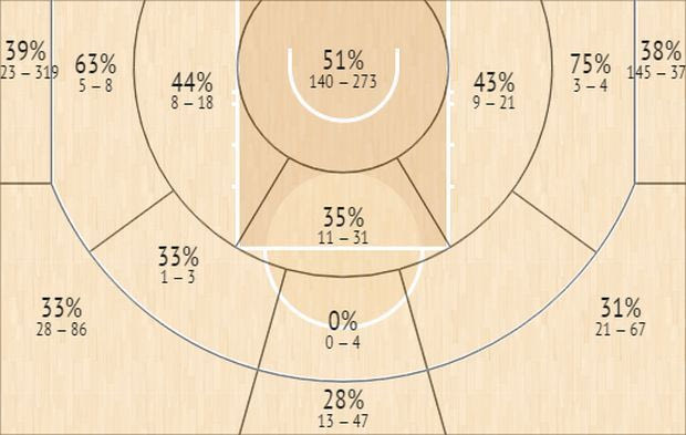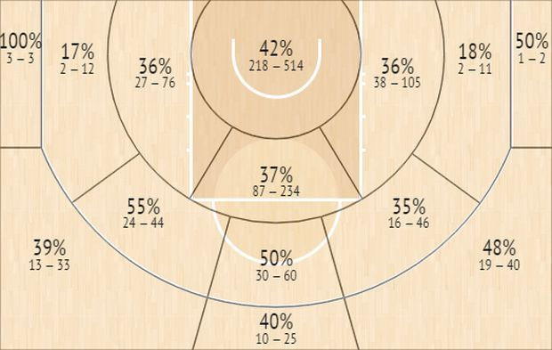 Κοιτάζοντας τους αριθμούς, δεν γίνεται να μην καταλάβει κάποιος το τεράστιο πρόβλημα των Μπακς όταν ξαφνικά ο Λόπεζ έπρεπε να μαρκάρει στην περιφέρεια, αφού οι αντίπαλοί των Μπακς σούταραν με τρομερά ποσοστά από το τρίποντο (39% αριστερά στις 45 μοίρες, 40% από την κορυφή και 48% δεξιά από τις 45 μοίρες) λόγω της αδυναμίας του Λόπεζ να ακολουθήσει μακριά από το καλάθι. Ακόμα χειρότερα, οι αντίπαλοι σούταραν με ποσοστό 55% (!) στα σουτ από μέση απόσταση από τις 45 μοίρες (αριστερά) και 50% από την κορυφή της ρακέτας, στο κατά πολλούς πιο δύσκολο σουτ στο σύγχρονο μπάσκετ (σουτ μετά από ντρίμπλα).