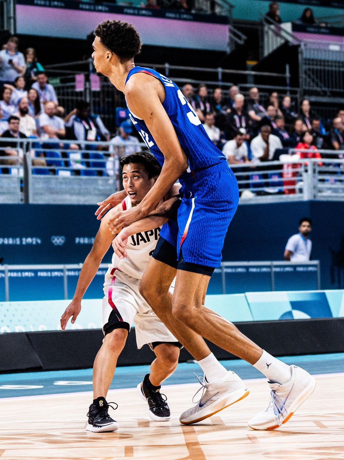 Πώς είναι όταν ο πιο κοντός παίκτης των Ολυμπιακών Αγώνων μαρκάρει τον πιο ψηλό; Η απάντηση δόθηκε στη διάρκεια του αγώνα της Γαλλίας με την Ιαπωνία, το βράδυ της Τρίτης 30 Ιουλίου.