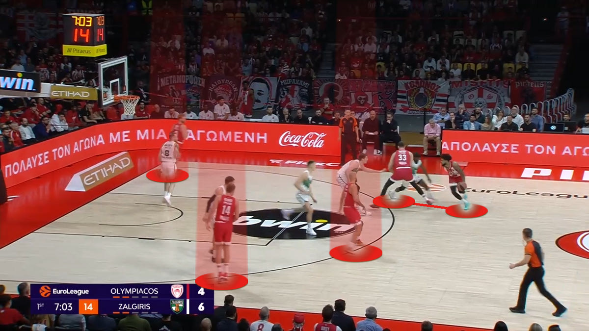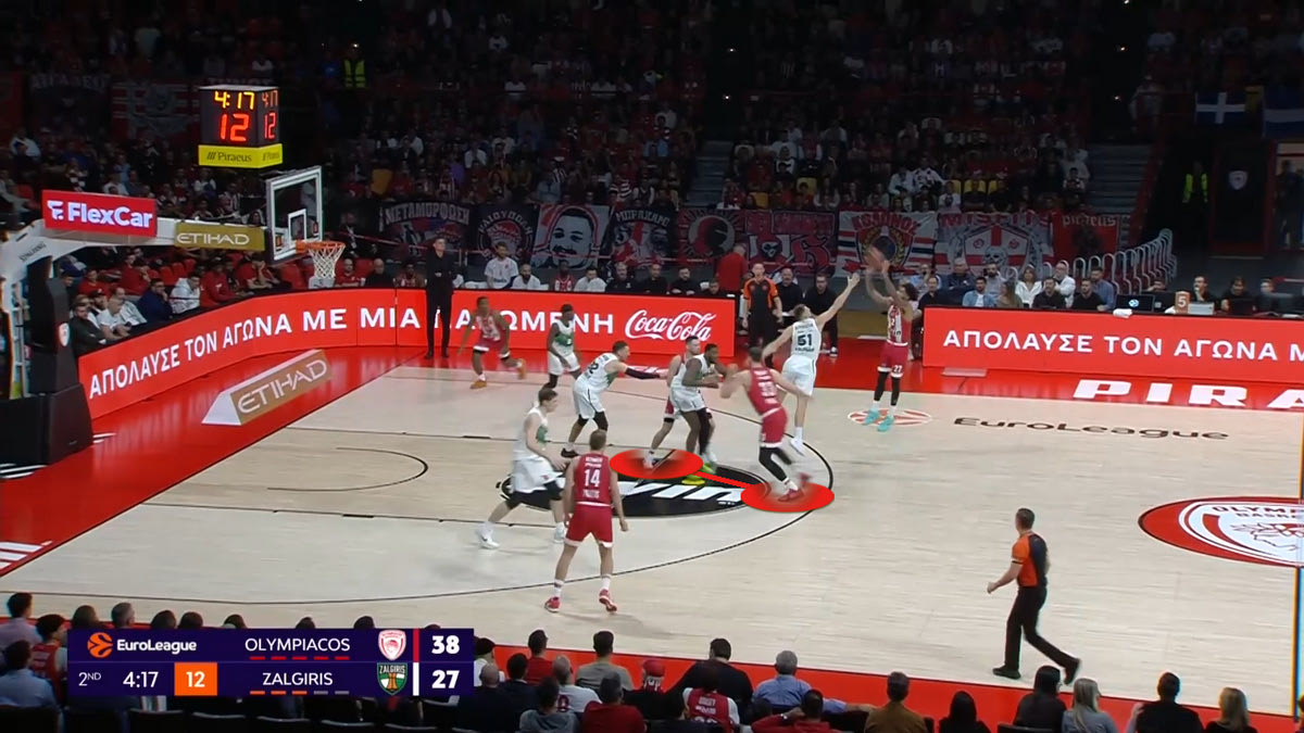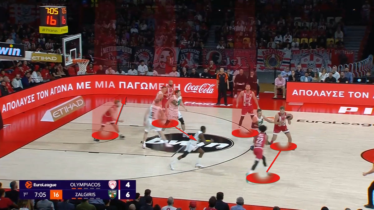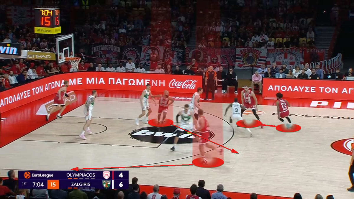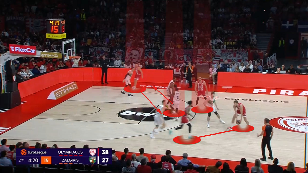 *Με κυκλάκι τα ευστοχα σουτ, με “x” τα άστοχαΟ Ντόρσεϊ συνέχισε τις εξαιρετικές εμφανίσεις, με τον Ολυμπιακό να τον απελευθερώνει με ένα από τα πλέον γνωστά plays του: Ένα play όπου ο Ντόρσεϊ αρχικά παίρνει την μπάλα σε κατάσταση handoff (πάσα χέρι με χέρι) από τον Βεζένκοβ και στην συνέχεια η φάση εξελίσεται σε Spain Pick and Roll, όπου ο Ντόρσεϊ παίρνει σκριν από τον Μιλουτίνοβ και την ίδια στιγμή το τριάρι της ομάδας (Φουρνιέ ή Παπανικολάου) επιλέγει αν θα δώσει σκριν στον Μιλουτίνοβ ή θα βγει στο τρίποντο. Ιδού ένα παράδειγμα: