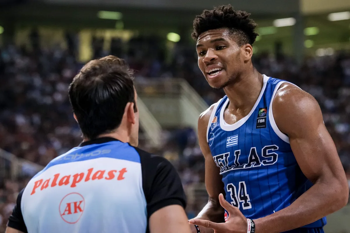 Ο διαιτητής, Βασίλης Πιτσίλκας, με τον Γιάννη Αντετοκούνμπο
