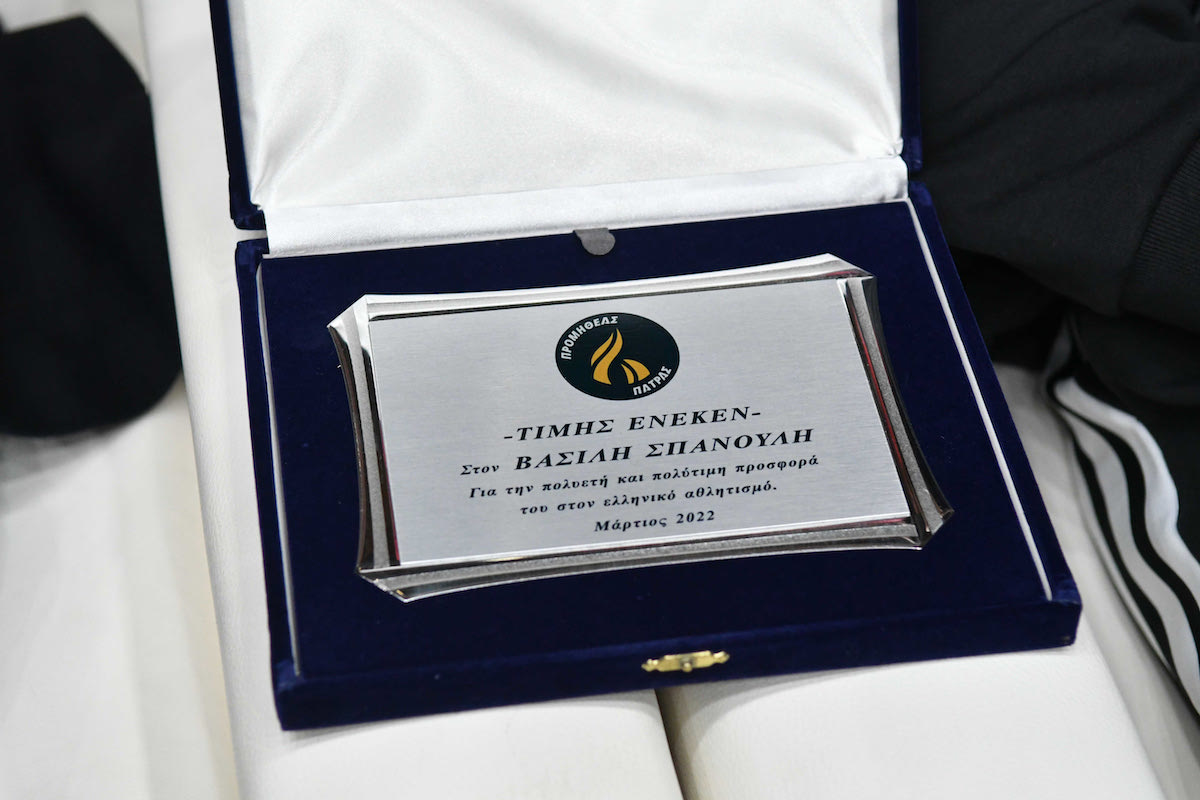 Ο Προμηθέας Πάτρας βράβευσε τον Βασίλη Σπανούλη στο ημίχρονο του αγώνα ανάμεσα στους Πατρινούς και τη Βίρτους Μπολόνια, για την πολυετή και μεγάλη προσφορά του στο ελληνικό μπάσκετ.