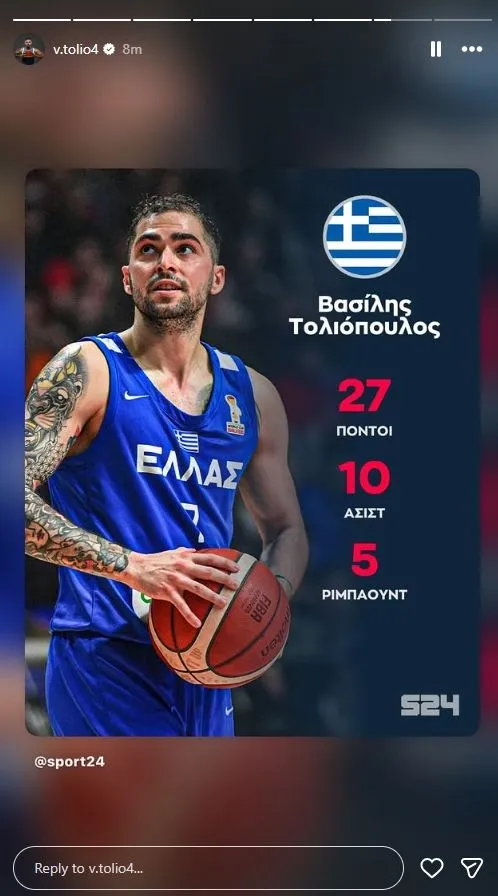 Ο Βασίλης Τολιόπουλος πόσταρε στο Instagram του την ανάρτηση του SPORT24 για τα τρία ρεκόρ που σημείωσε με την Εθνική Ελλάδας κόντρα στο Μαυροβούνιο, στο πλαίσιο της 4ης αγωνιστικής των προκριματικών του MundoBasket 2027.