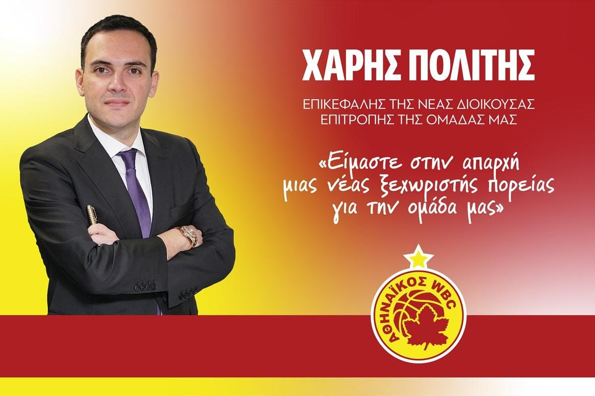 Ο Χάρης Πολίτης, γιος του αειμνήστου Προέδρου του ΔΣ του Αθηναϊκού και της ποδοσφαιρικής ομάδας μας, την εποχή που μεσουρανούσε στα σαλόνια της Α’ και Β’ Εθνικής κατηγορίας, Γιώργου Πολίτη, αναλαμβάνει τα ηνία της ομάδας σε μια περίοδο που οι στόχοι της για την επόμενη τριετία τη θέλουν πρωταγωνίστρια σε Ελλάδα και Ευρώπη.