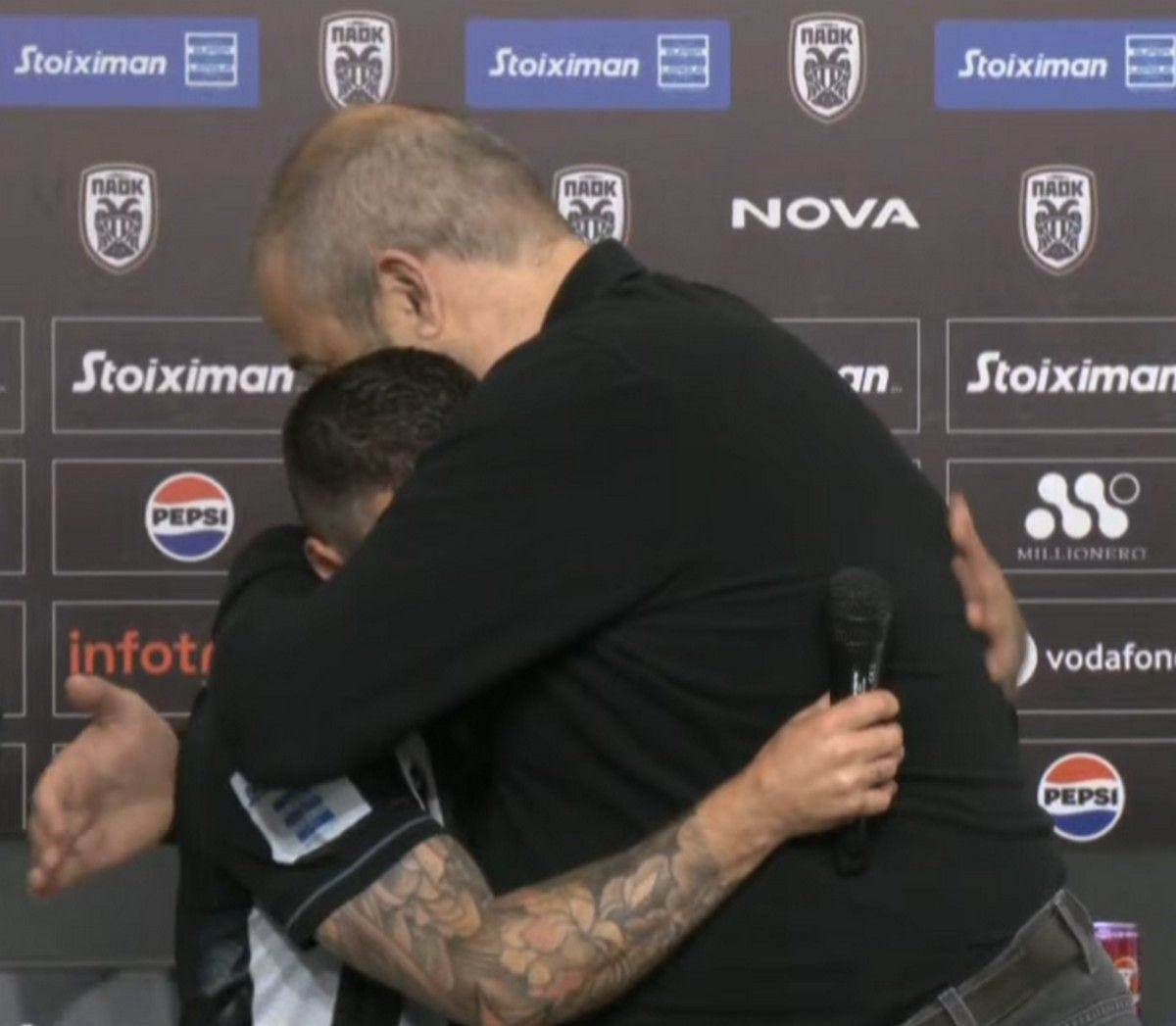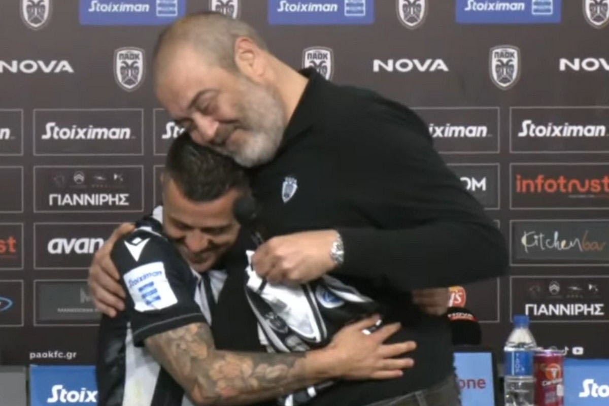 Ο Χατζόπουλος έδωσε φανέλα του μπασκετικού ΠΑΟΚ στον Βιεϊρίνια και τον αγκάλιασε σαν γιο του