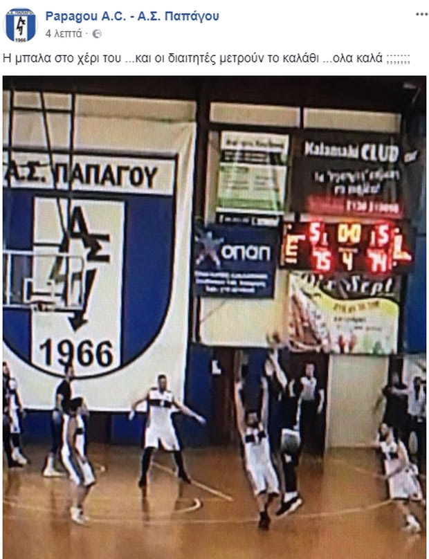 Οι άνθρωποι του Παπάγου φωνάζουν πάντως για το νικητήριο καλάθι του Απόλλωνα Πάτρας, ισχυριζόμενοι ότι η μπάλα βρισκόταν στα χέρια του όταν μηδενίστηκε το χρονόμετρο. “Ανέβασαν” μάλιστα σχετική φωτογραφία στη σελίδα τους στο Facebook.