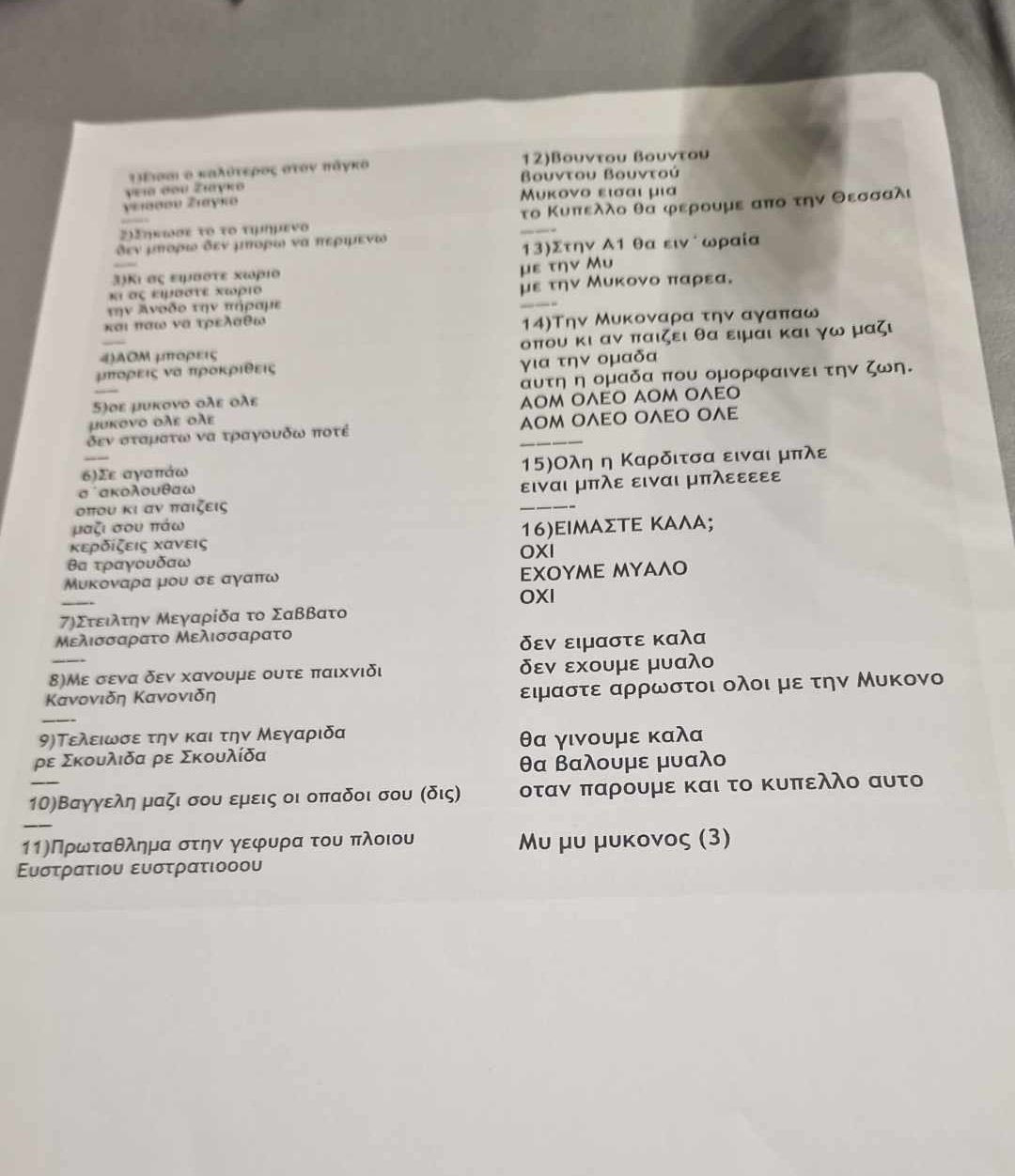 Οι άνθρωποι της Μυκόνου τύπωσαν χαρτιά με αριθμημένα 16 μη υβριστικά συνθήματα. Μερικά από τα πιο ευφάνταστα από αυτά είναι τα παρακάτω: “Πρωτάθλημα στην γέφυρα του πλοίου, Ευστρατίου, Ευστρατίου”, “Με σένα δεν χάνουμε ουτέ παιχνίδι, Κανονίδη, Κανονίδη”.