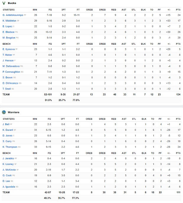 Το βράδυ για τα “ελάφια” ήταν τόσο εύκολο, που ξέφυγαν με 15 πόντους διαφορά από το πρώτο ημίχρονο, διεύρυναν το προβάδισμά τους στο +26 στο τέλος της τρίτης περιόδου (79-105) και προηγήθηκαν ακόμα και με +31 στην τέταρτη! Πέρα από τον Αντετοκούνμπο, εξαιρετικοί ήταν και οι Ερικ Μπλέντσο (26 πόντοι, 10/12 σουτ, 6 ασίστ), Κρις Μίντλετον (17 πόντοι, 6 ασίστ), Μάλκολμ Μπρόγκντον (20 πόντοι, 9/14 σουτ) και Πατ Κόνατον (15 πόντοι) για τα “ελάφια”, που έκαναν σχεδόν το… τέλειο παιχνίδι στο Γκόλντεν Στέιτ.