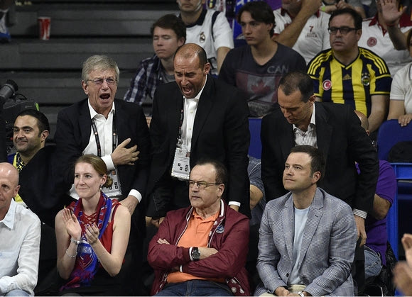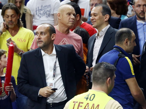 Παναγιώτης και Γιώργος Αγγελόπουλος στο Barclaycard Center λίγα λεπτά πριν το τζάμπολ ανάμεσα σε Ρεάλ και Ολυμπιακό.