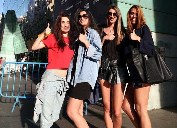 Όμορφες παρουσίες ποζάρουν έξω από το Barclaycard Center, λίγο πριν εισέλθουν στο γήπεδο που φιλοξενεί το Final-4.